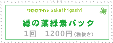 「緑の葉緑素パック」は、主成分が葉緑素である「パスター」と呼ばれるパック剤をお顔にぬり、密封療法を用いて有効成分をお肌の深部へと届けるクロロフイルならではのパック。 当店では、ニキビ、シミ、肌アレなどのトラブルのためのケアとして、そして、トラブルがない方でも美しいお肌をキープするためのケアとして、多くの方にご愛用頂いている人気のパックです。 |